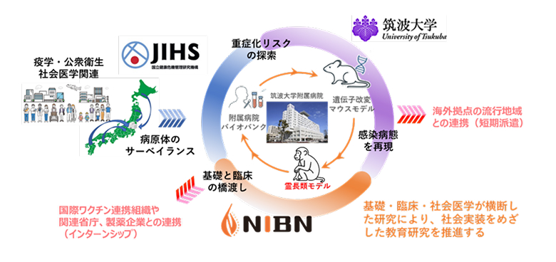 感染症危機管理学分野では、協働大学院として、筑波大学と国立健康危機管理研究機構(JIHS)、国立研究開発法人医薬基盤・健康・栄養研究所(NIBN)が参画し、感染症に関する基礎研究、社会実装、危機管理を柱とし、国際的に感染症対策を牽引できる高度専門職業人およびグローバルリーダーの育成をめざします。